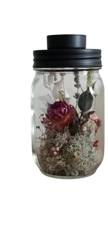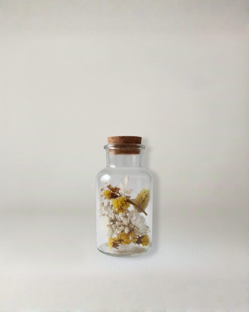 Glazen pot met droogbloemen en kurkdeksel